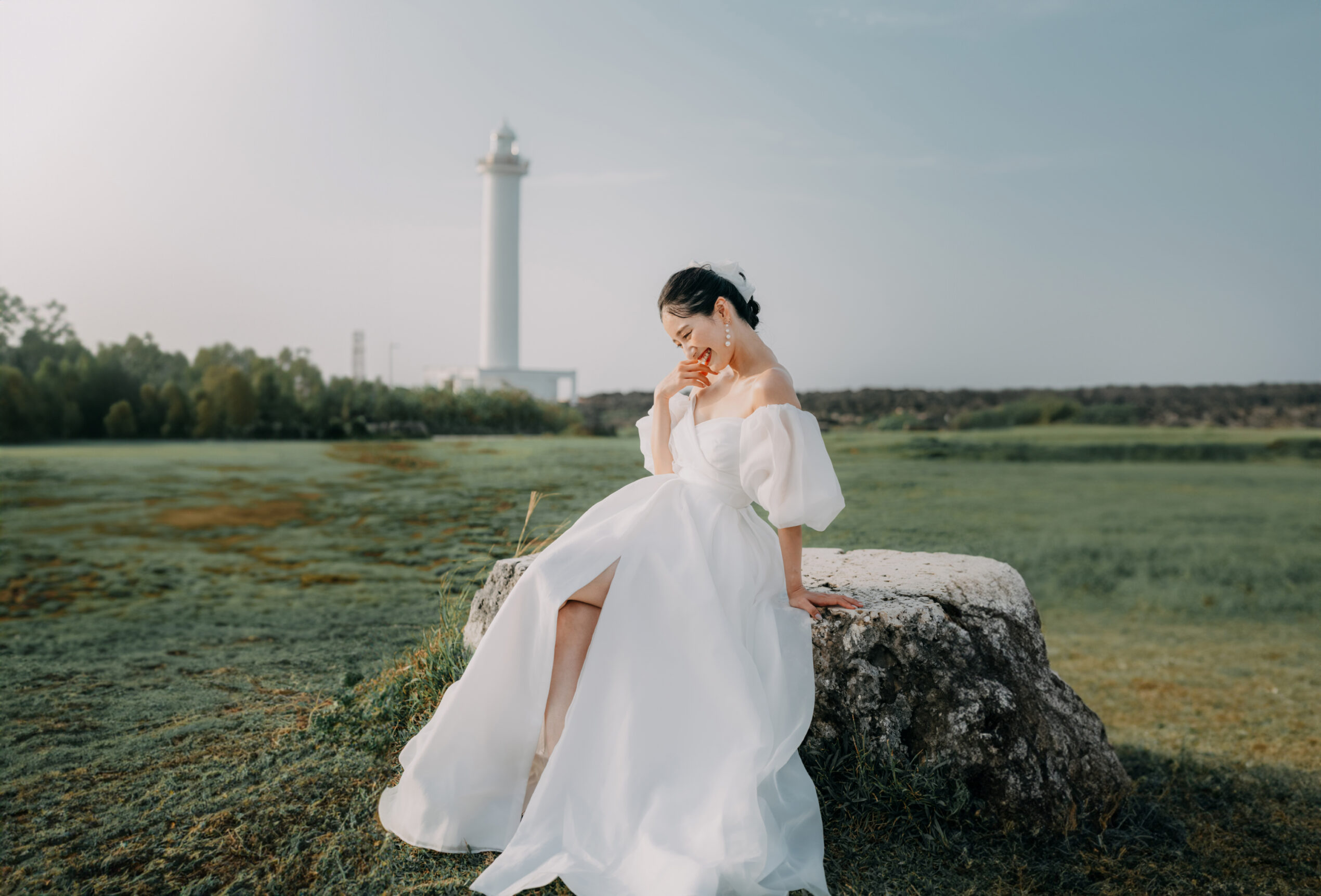 彼方に灯台を眺めながら低木の広がる緑地で撮影します