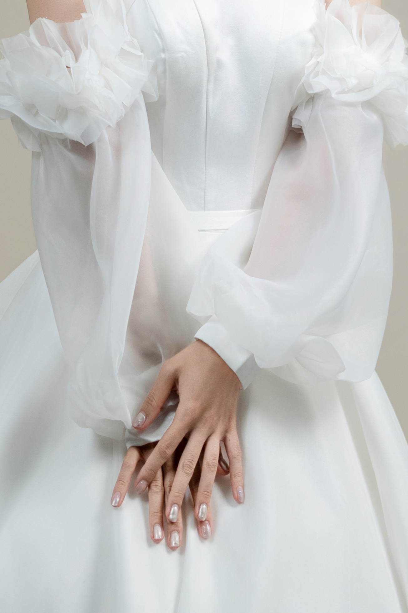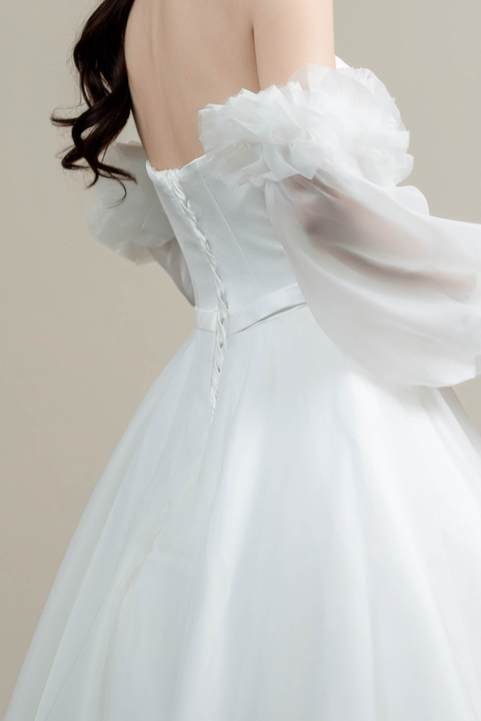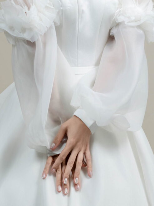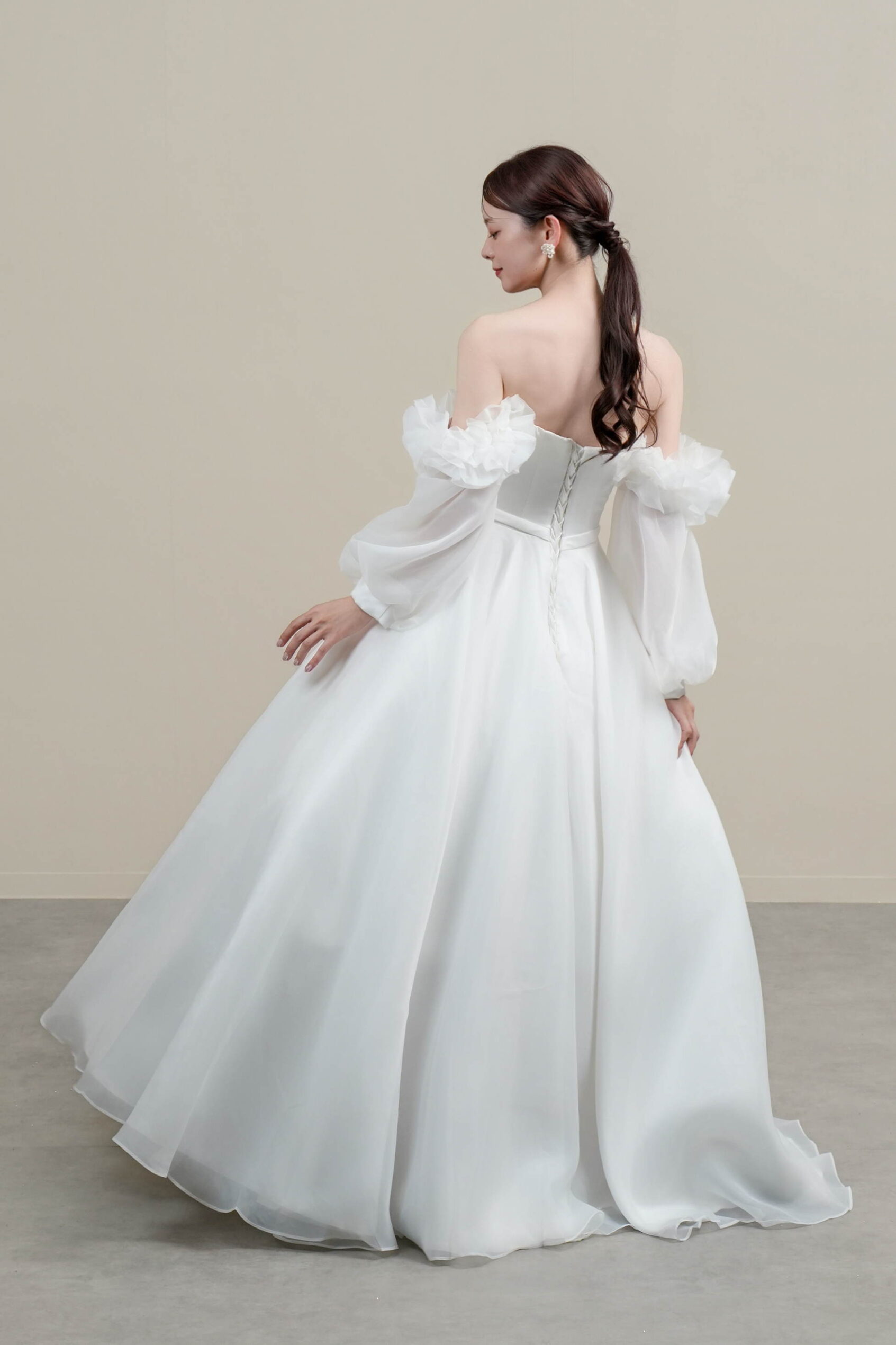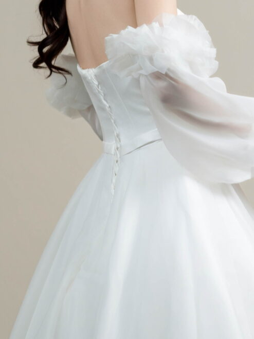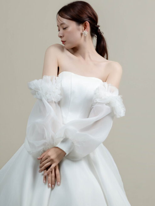 ふんわりと広がるAラインとオフショルダーのボリュームスリーブが華やかさを演出。クラシカルで気品あふれる一着です。
