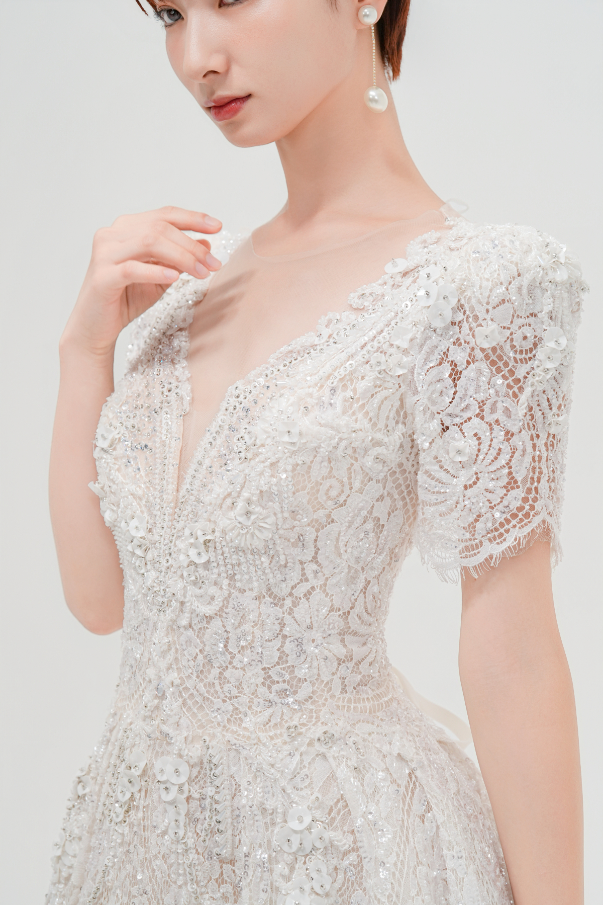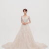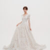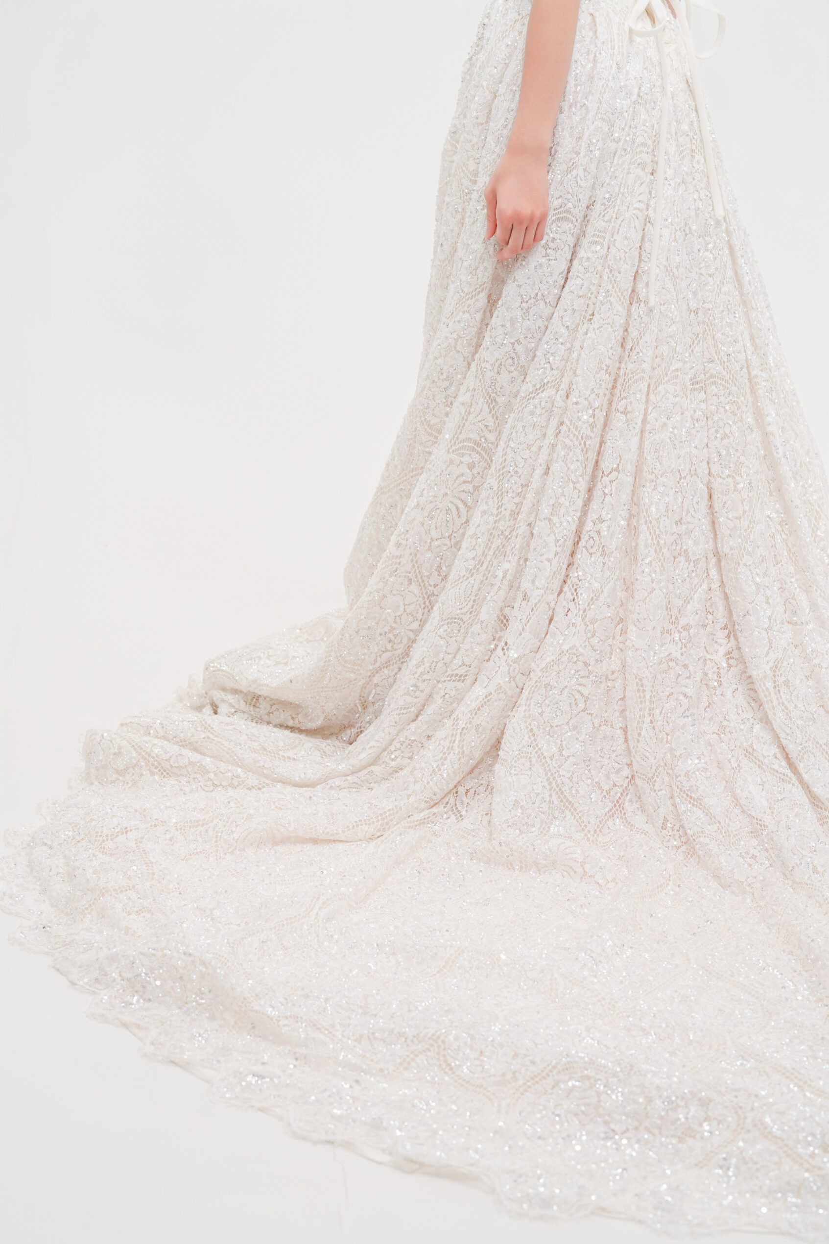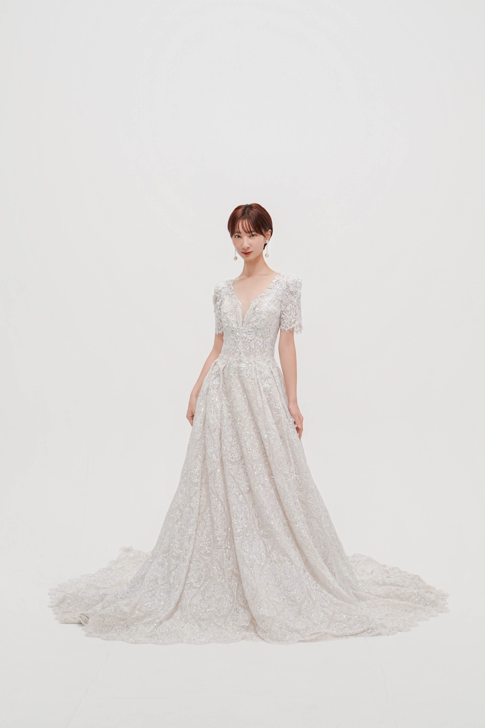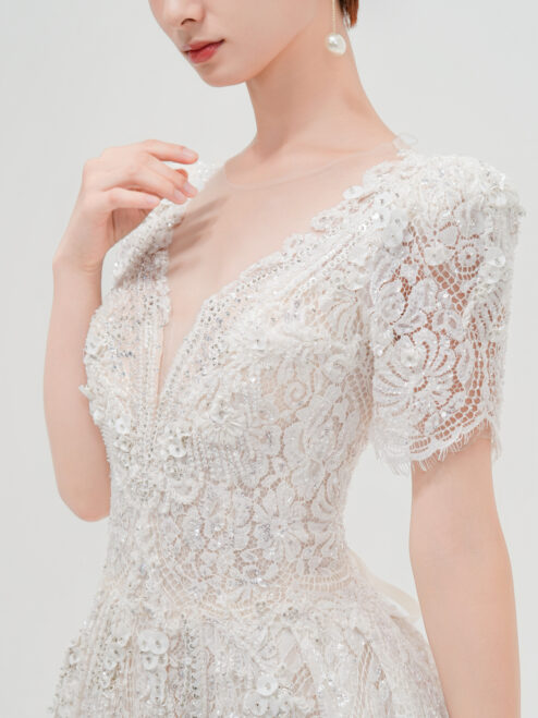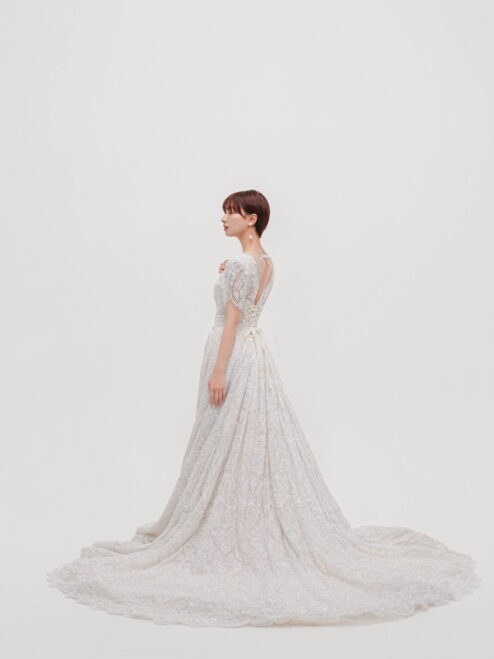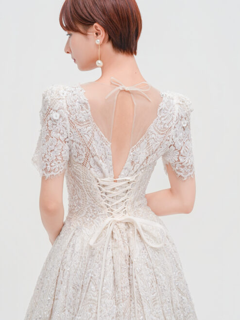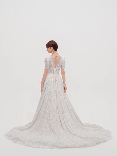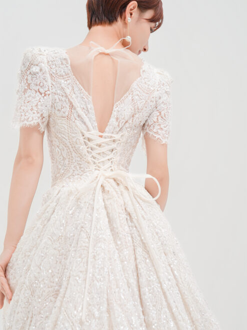 華やかな総レースと繊細なスパンコールが輝く一着。Vネックの胸元と背中のレースアップが女性らしさを引き立て、優美なトレーンが後ろ姿も印象的に演出。