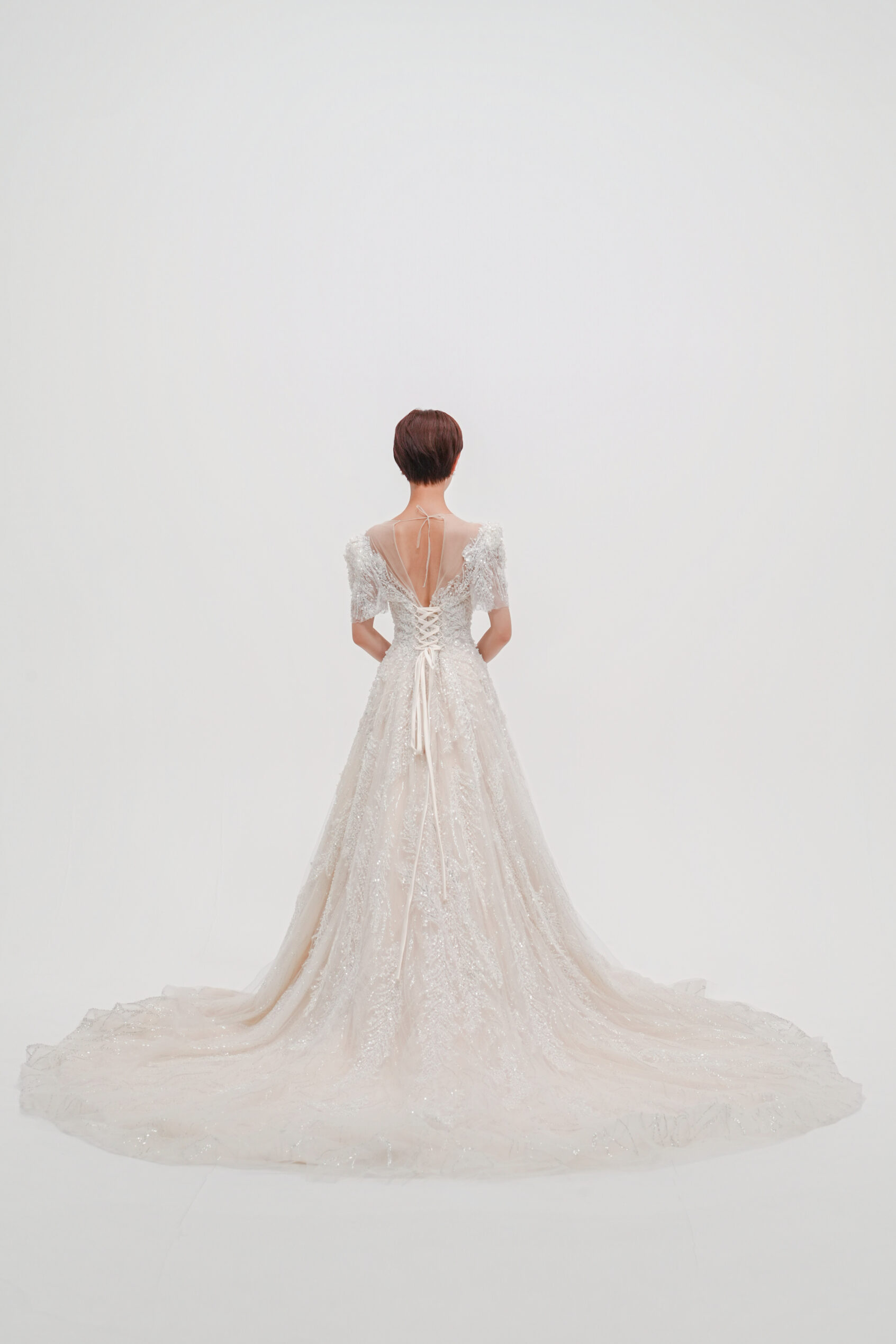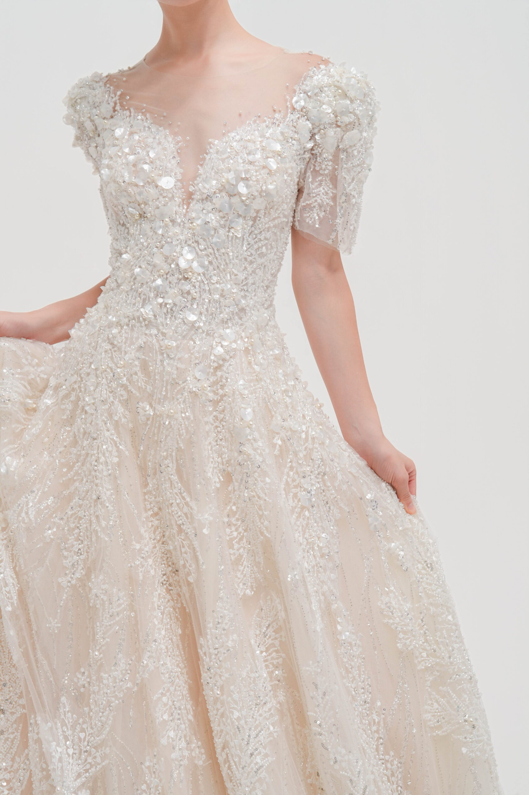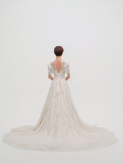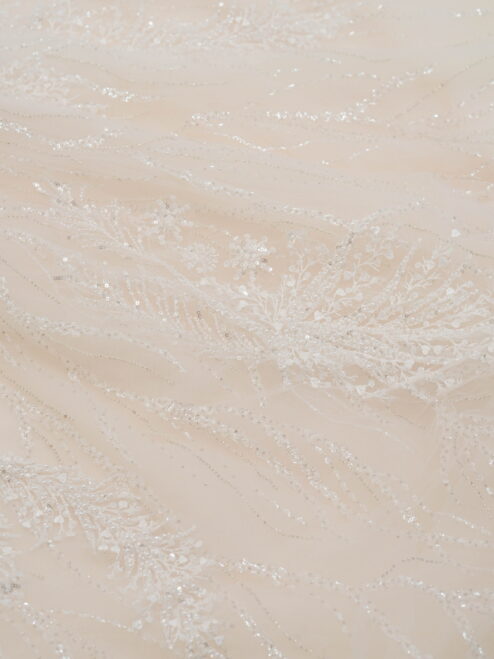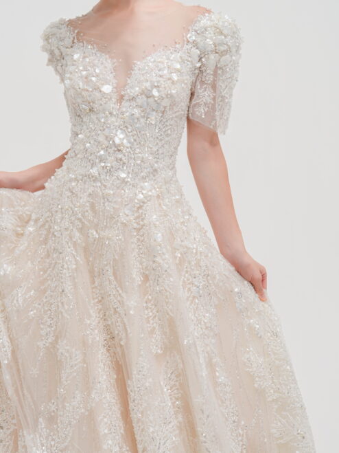 立体的なビーディングと花モチーフが全体に繊細に施された一着。軽やかなチュールと上品な透け感が、華やかさと可憐さを両立させます。