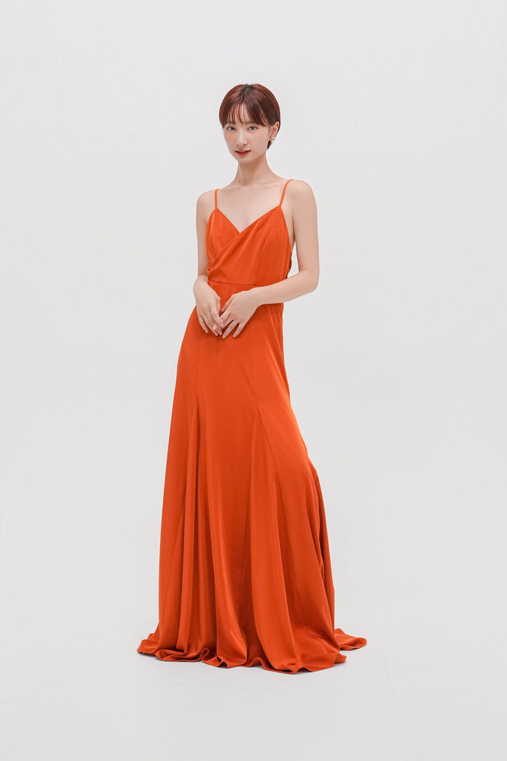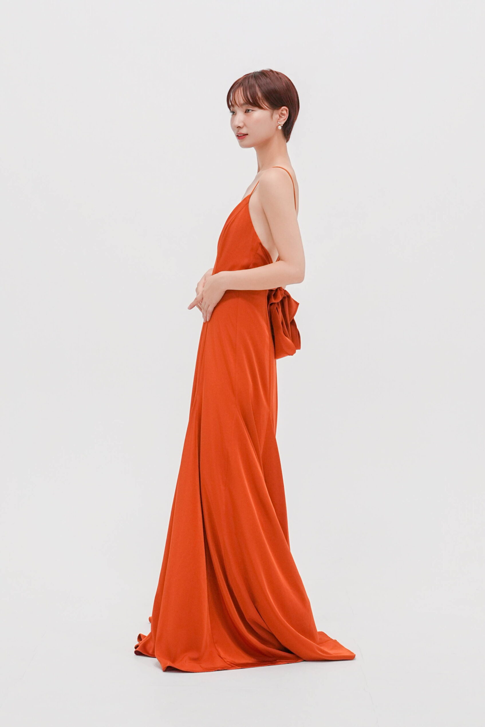 背中の大胆な開きと上質な素材がトレンド感のテラコッタドレス。