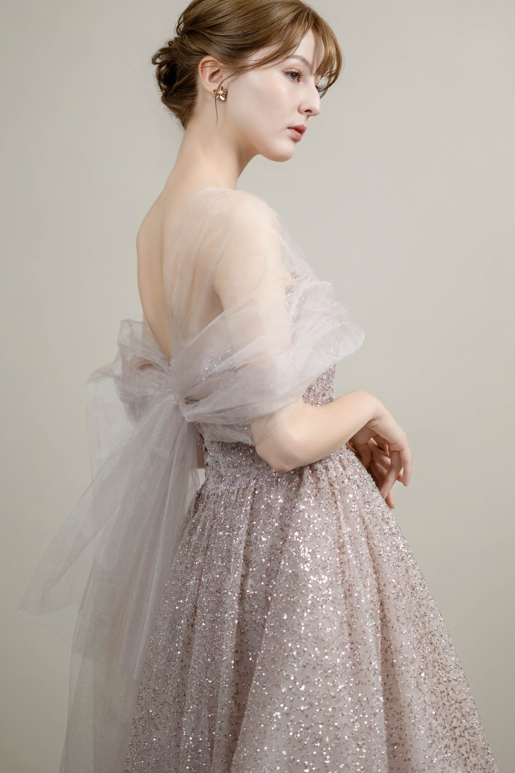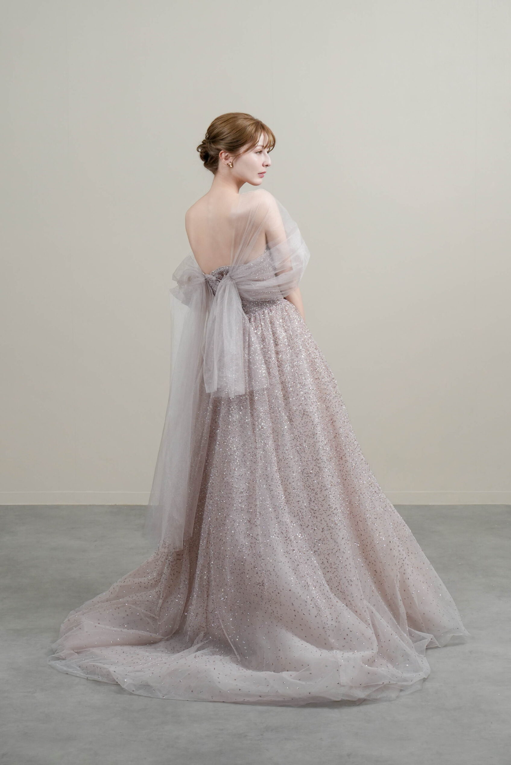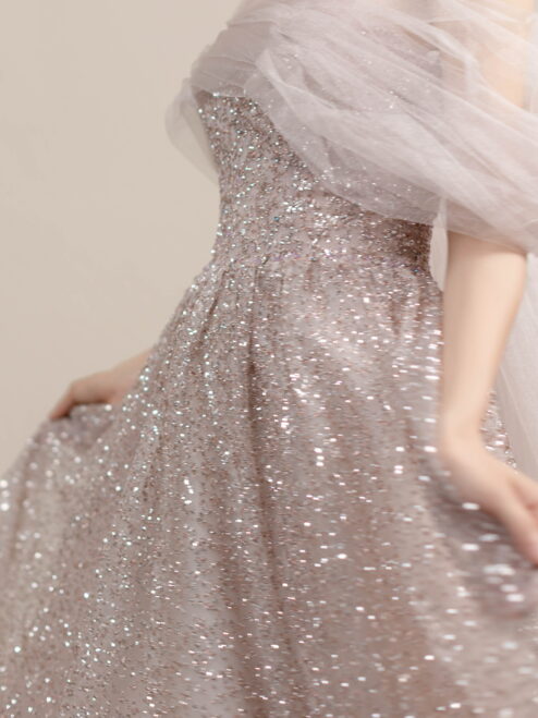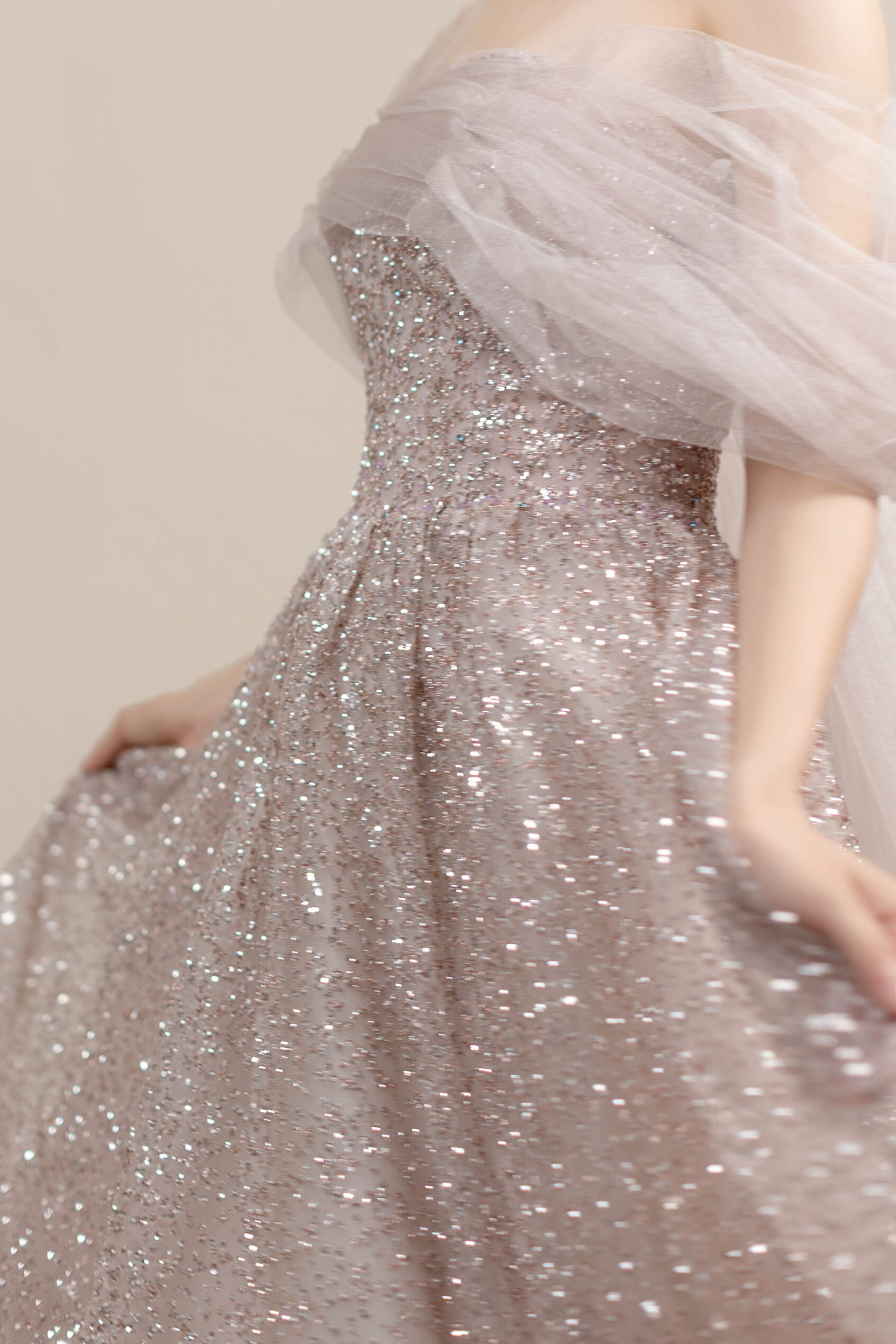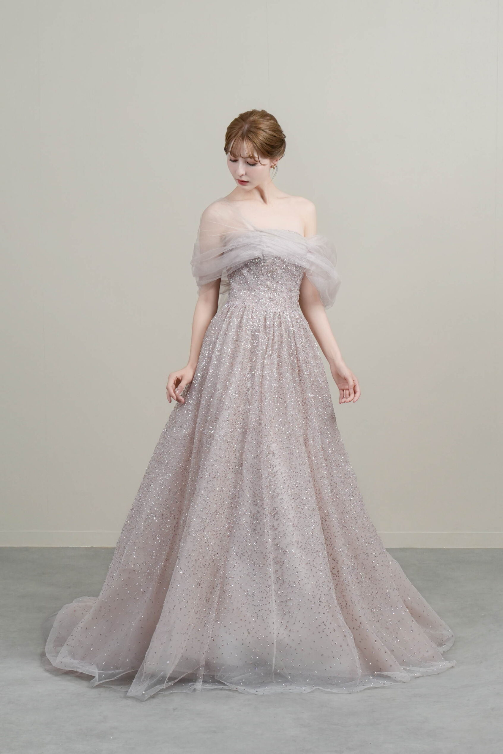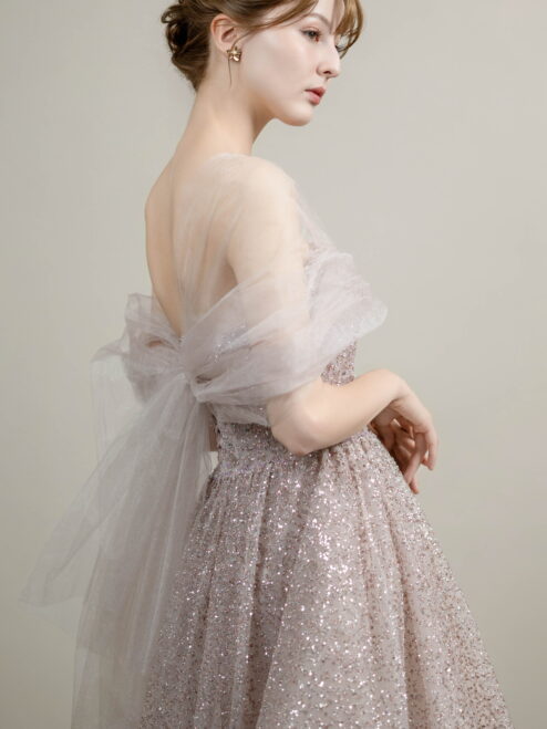 柔らかなラベンダーカラーに繊細なグリッターがきらめくドレス。チュールのオフショルダーとバックリボンが華やかさを添えます。