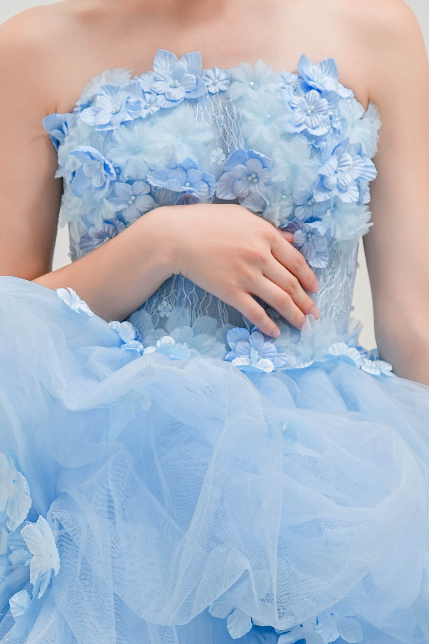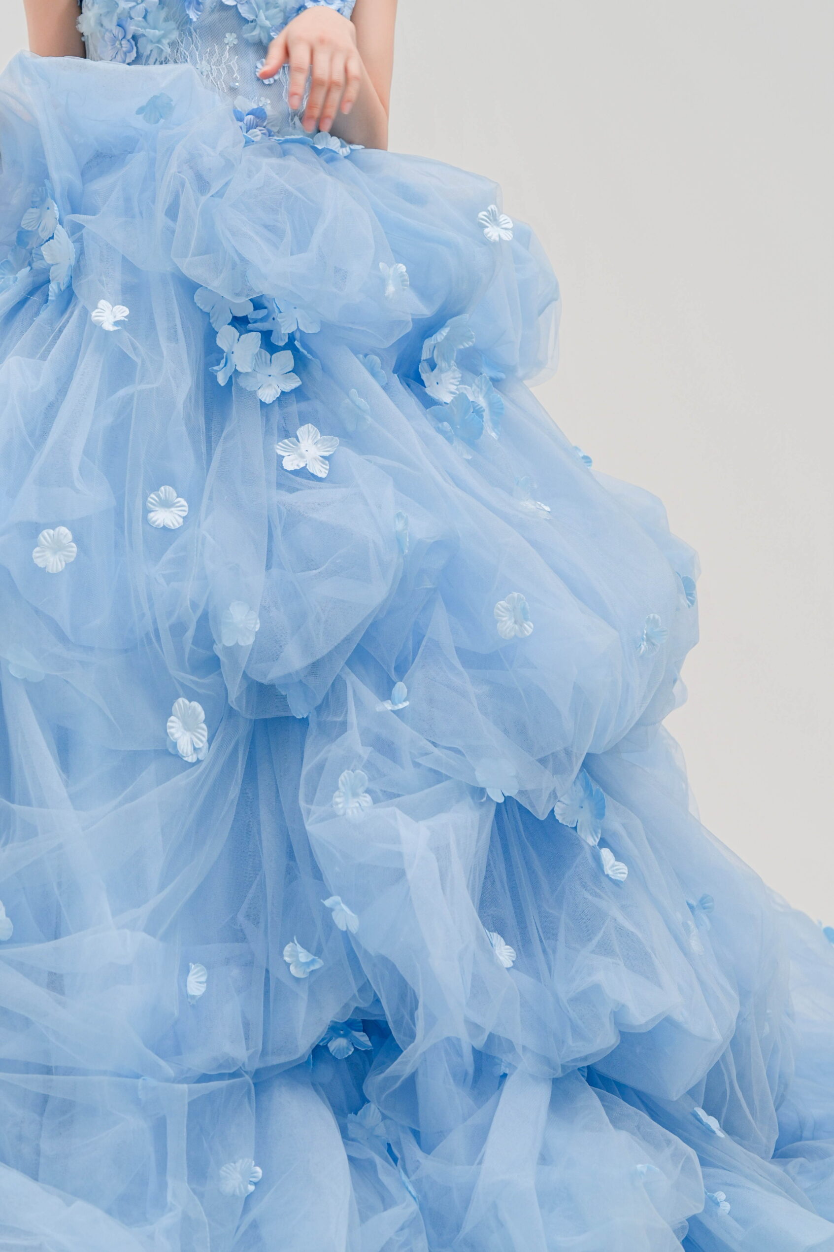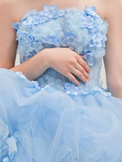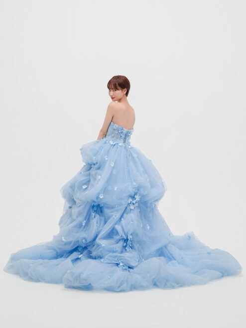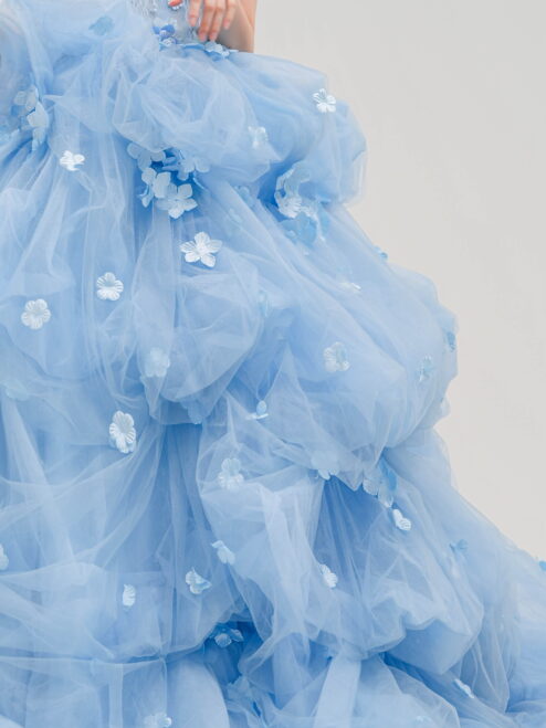 透明感のあるブルーに小花モチーフを散りばめた一着。軽やかなチュールがふんわり広がる、華やかで愛らしいプリンセスドレス。