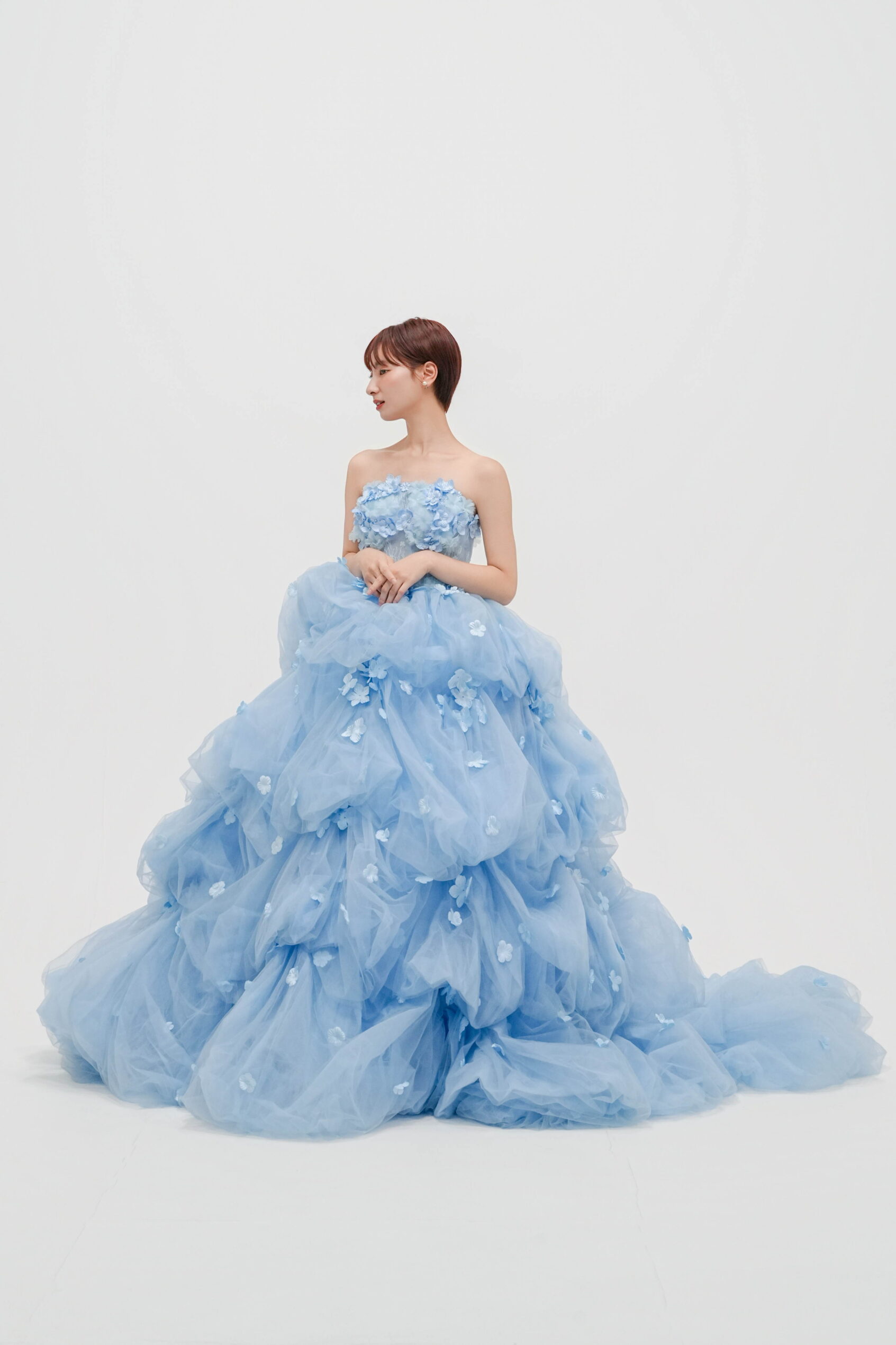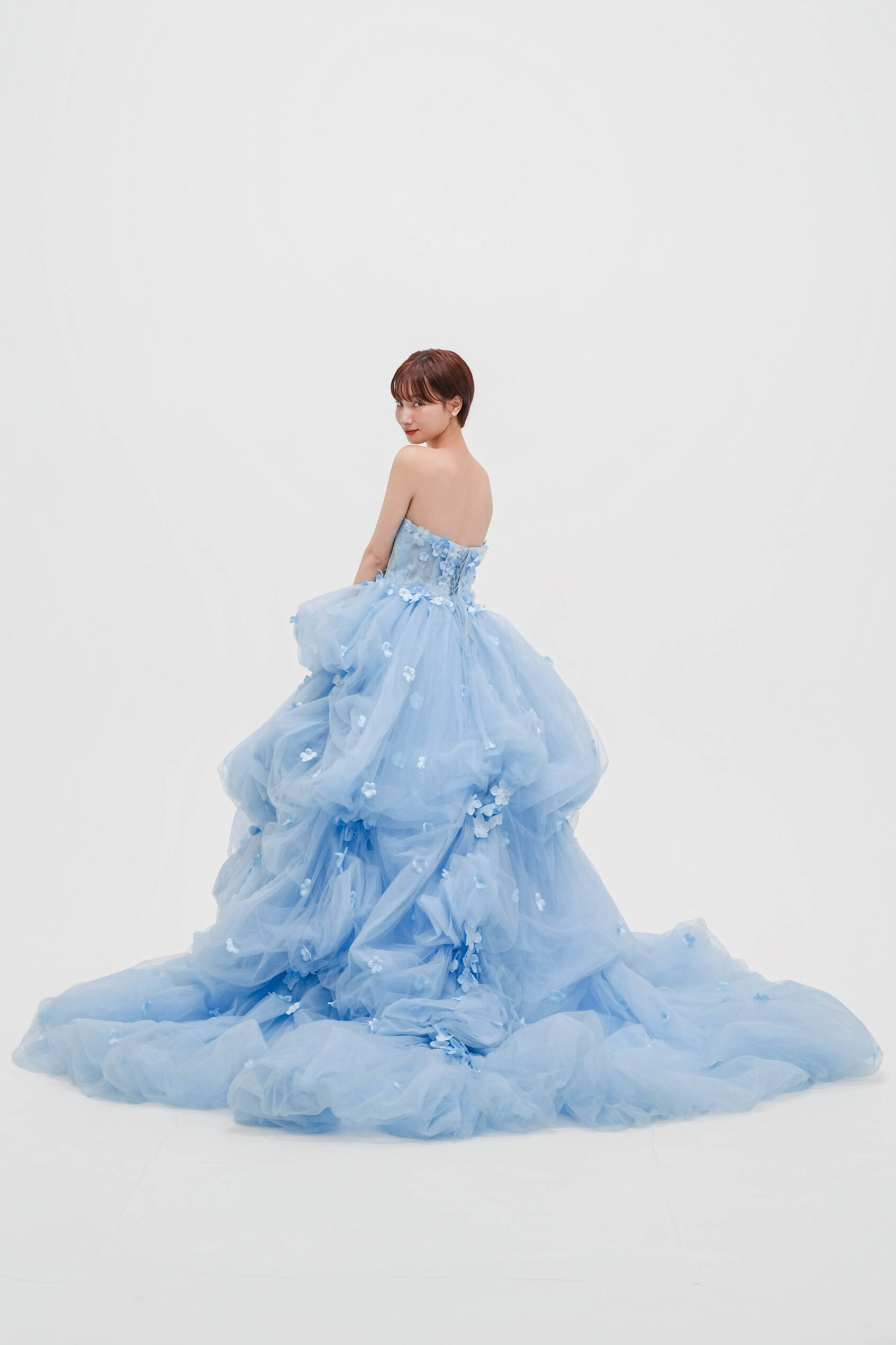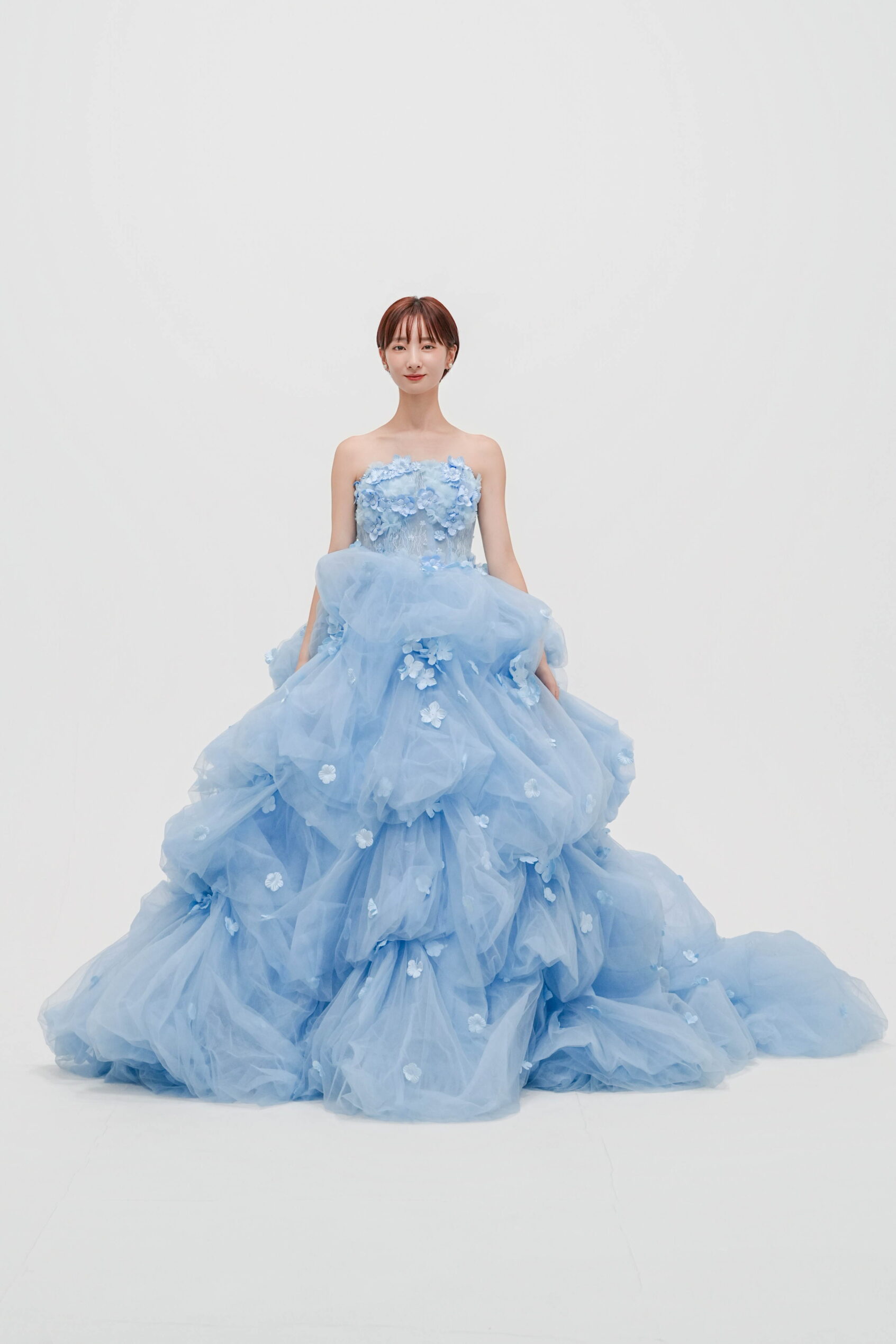 透明感のあるブルーに小花モチーフを散りばめた一着。軽やかなチュールがふんわり広がる、華やかで愛らしいプリンセスドレス。