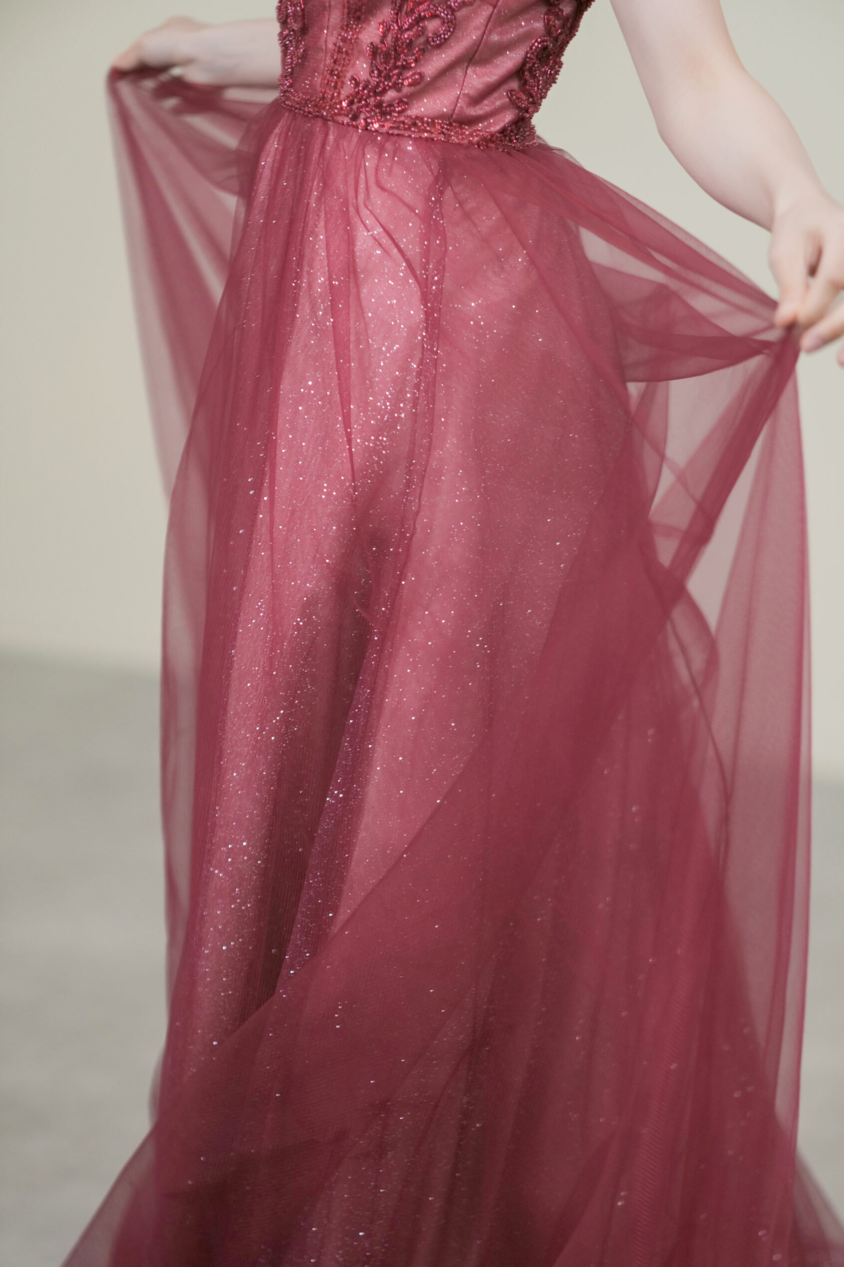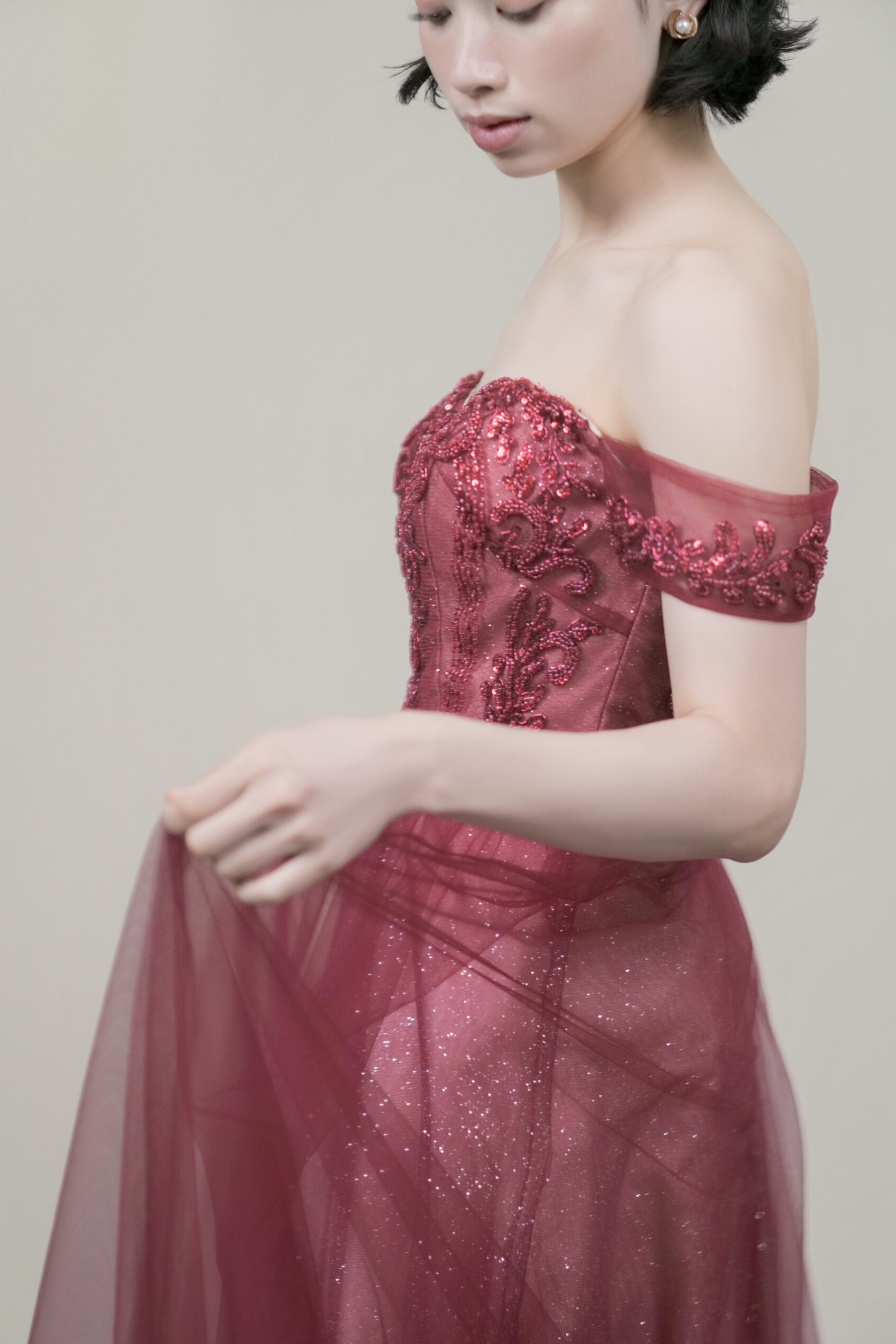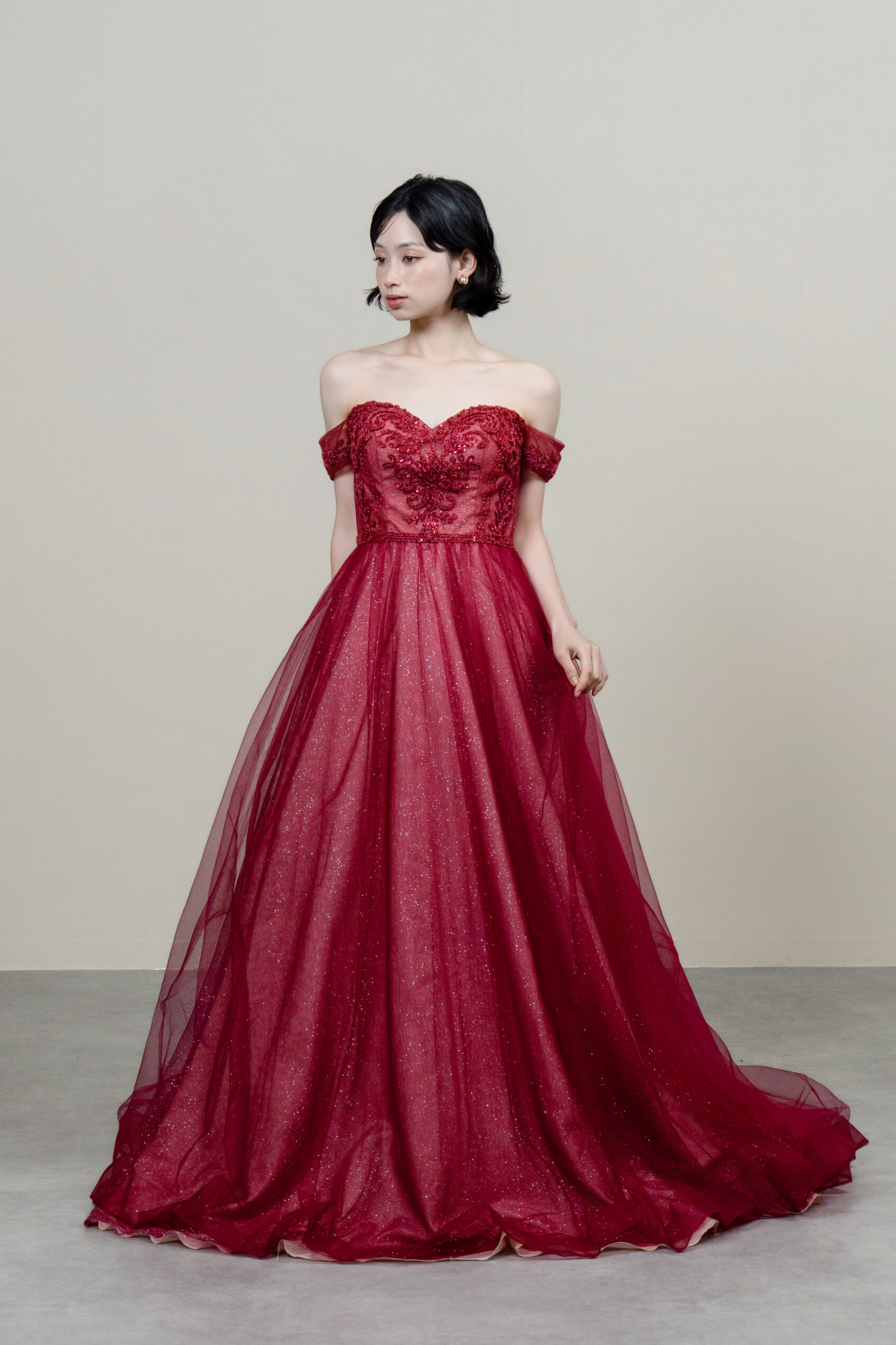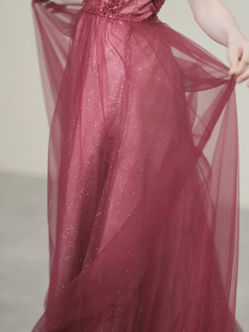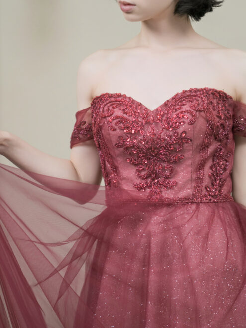 深みのあるボルドーカラーに繊細な刺繍とビジューが映える一着。煌めくチュールが華やかさと気品を演出します。