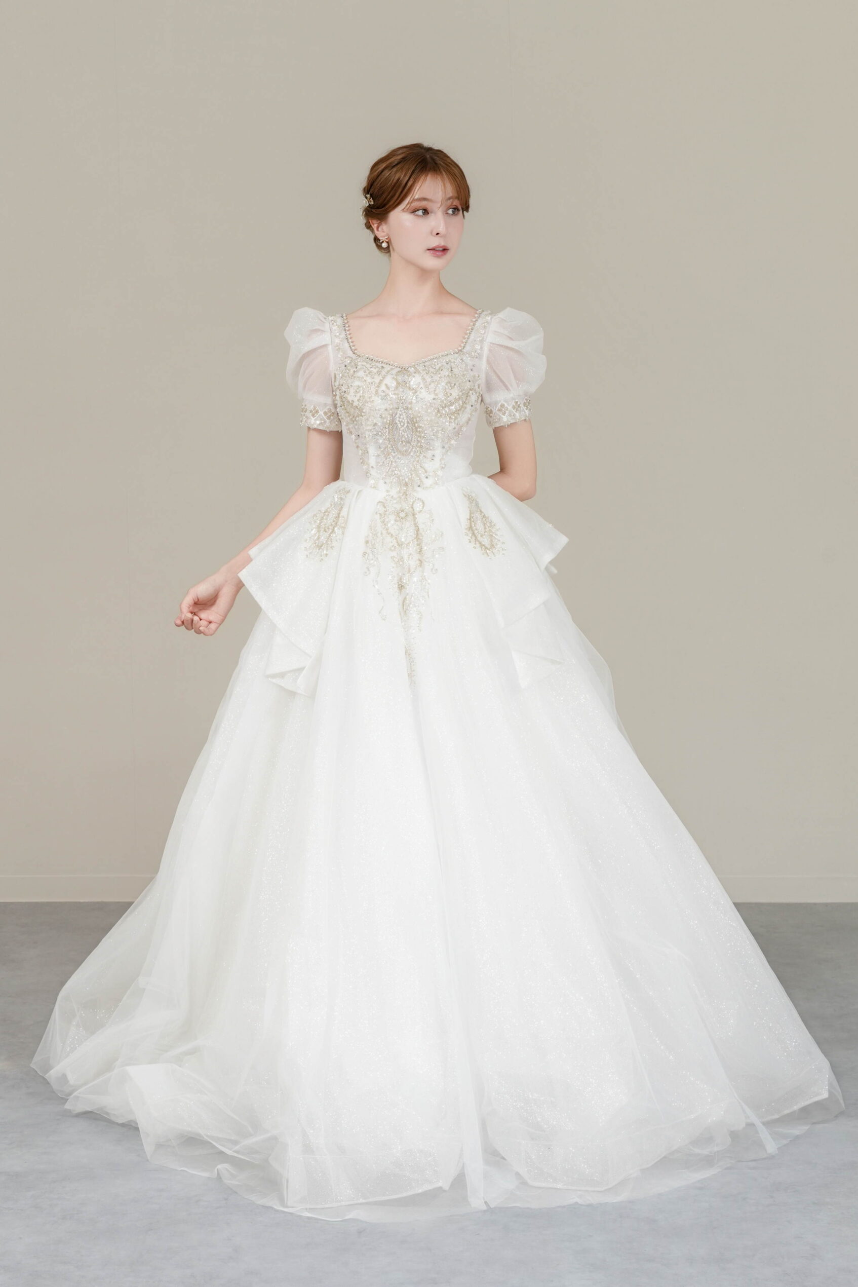 繊細な刺繍とパールが輝くクラシカルなプリンセスドレス。立体的なパフスリーブが華やかさを添え、気品ある佇まいを演出します。